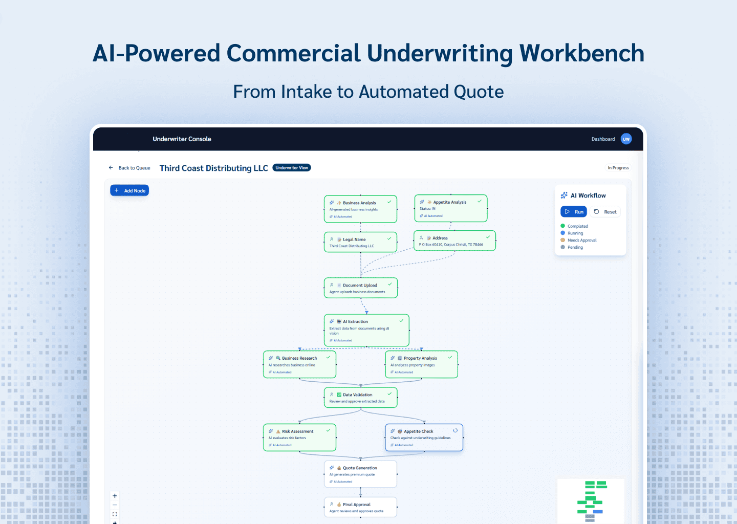 Reduced underwriting submission cycle time by ~40%. Redesigned a national insurance carrier's underwriting workflow with AI-assisted intake, routing logic, and visibility layers across agents and underwriters.