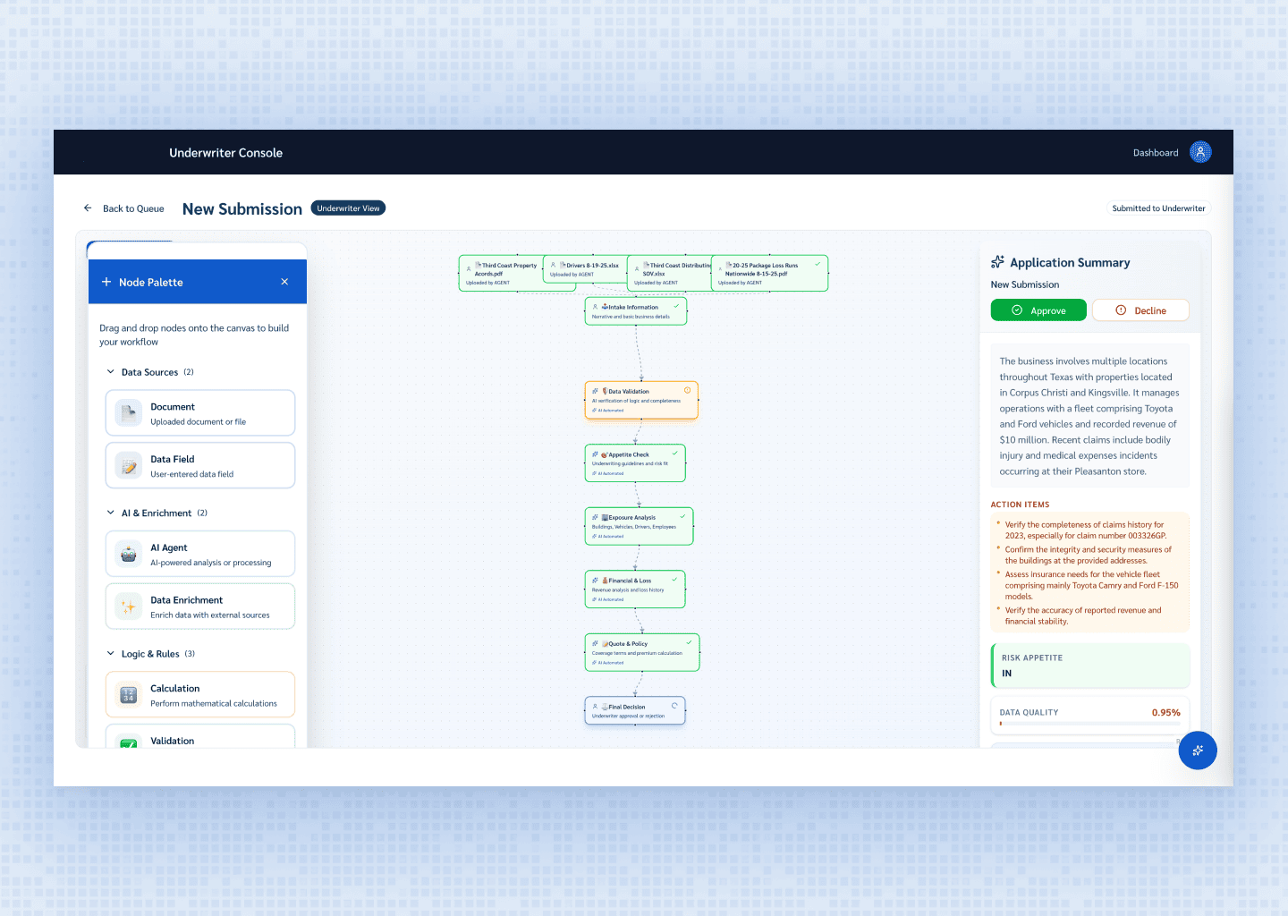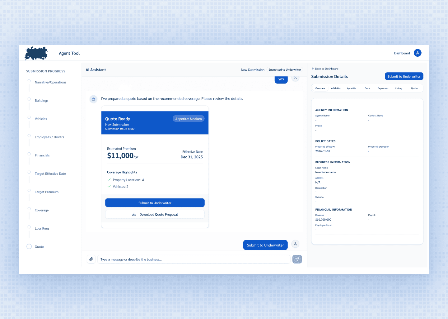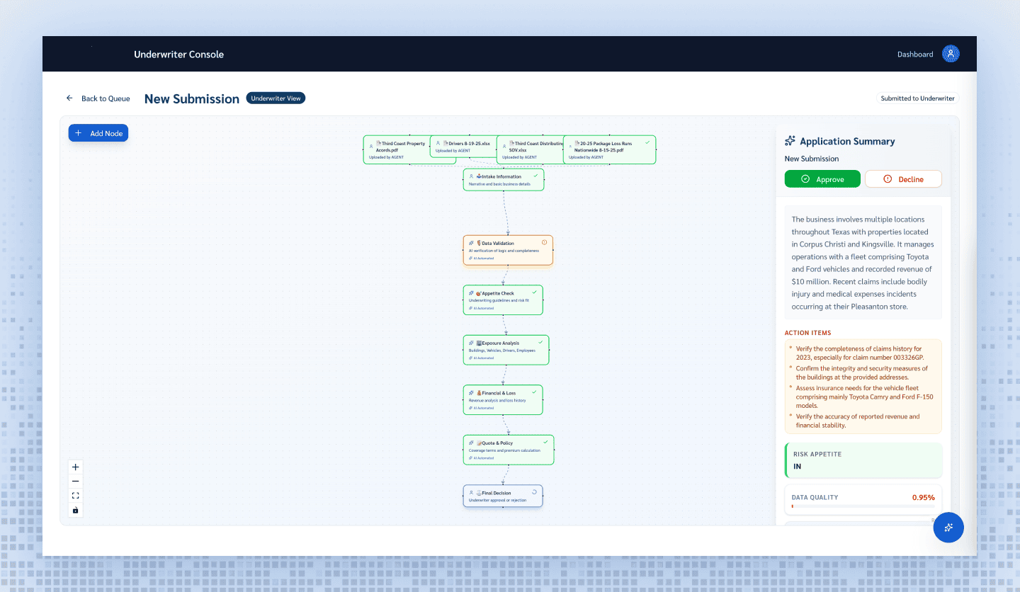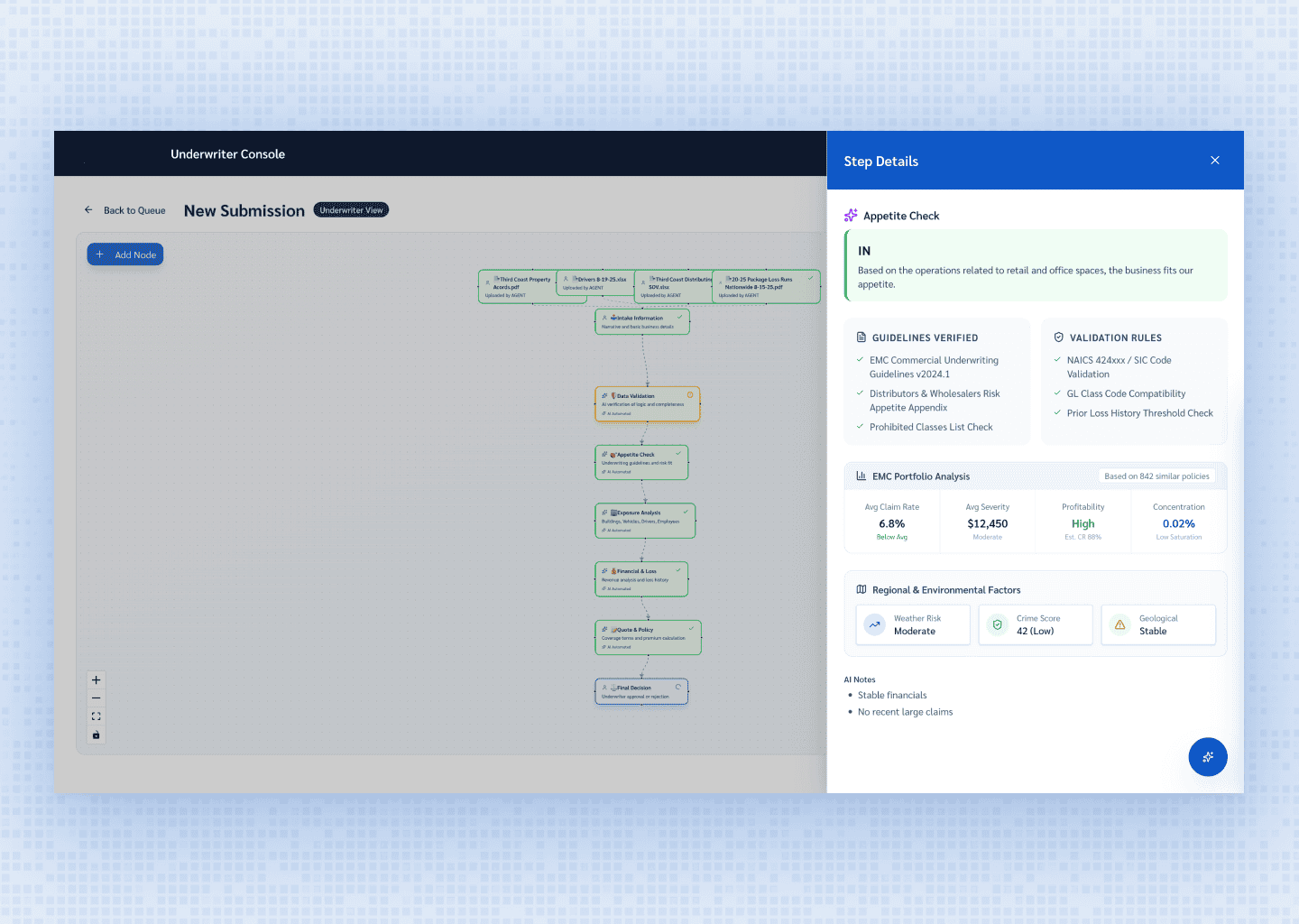 Beyond juggling emails, PDFs, and spreadsheets, they were constantly balancing conflicting company rules, complex guidelines, and profitability requirements—all while trying to hit a target premium. A huge portion of underwriting was mental — not visible to systems.
