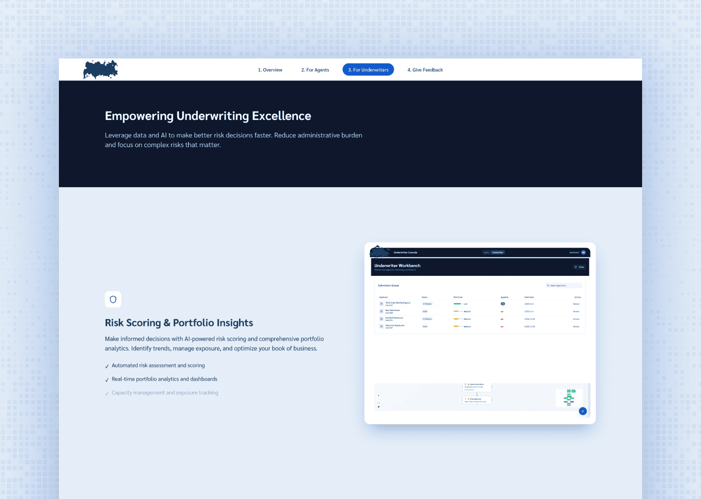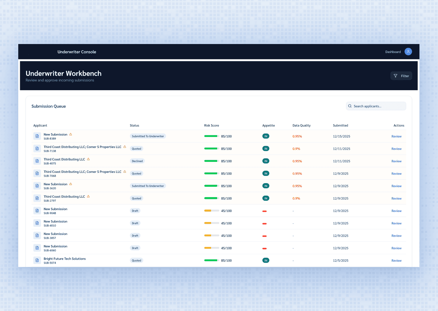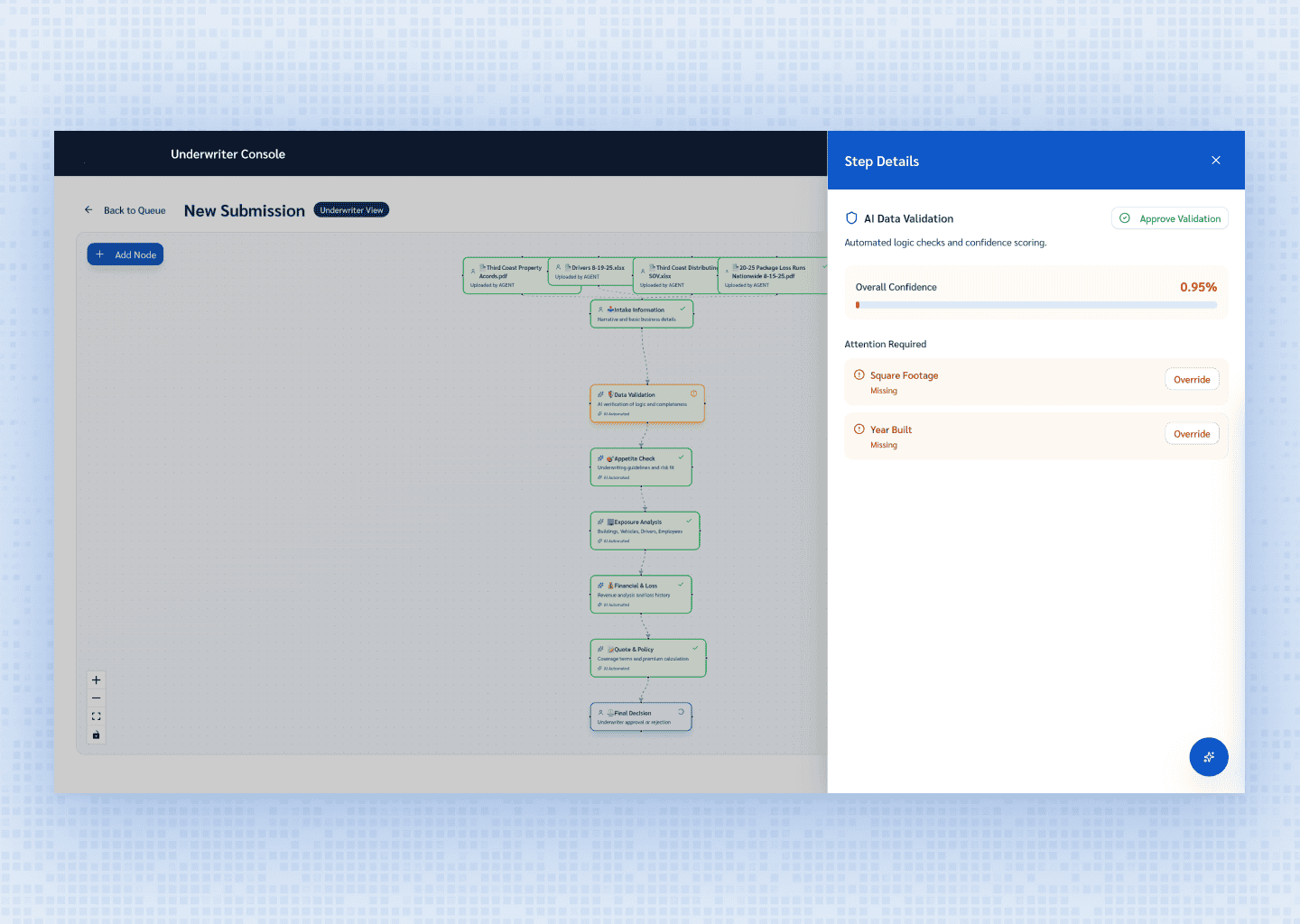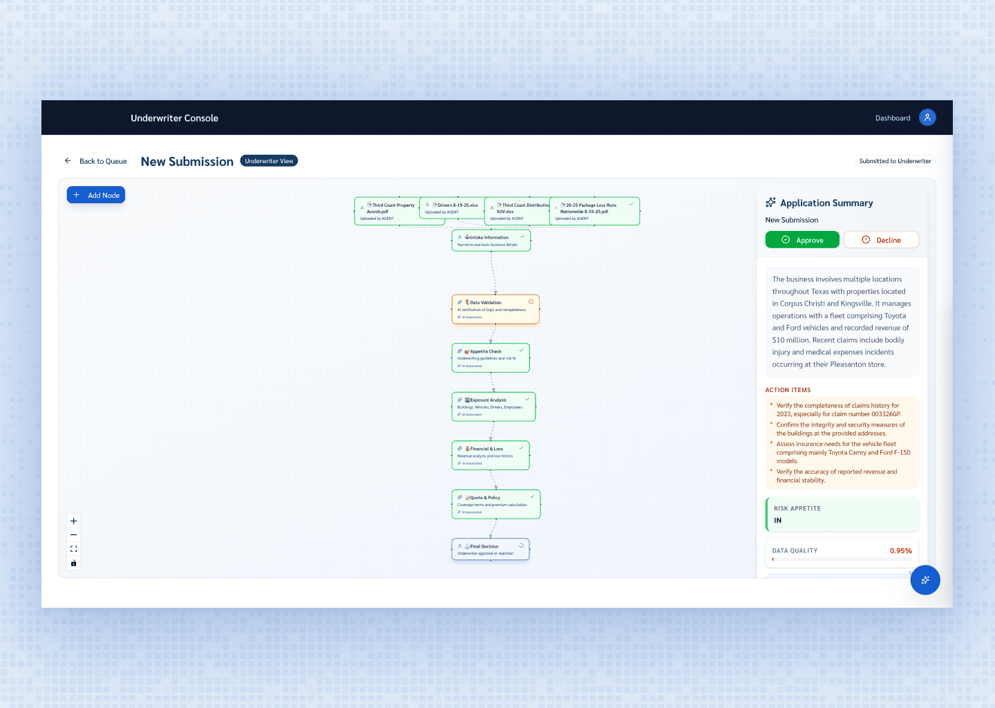 Beyond juggling emails, PDFs, and spreadsheets, they were constantly balancing conflicting company rules, complex guidelines, and profitability requirements—all while trying to hit a target premium. A huge portion of underwriting was mental — not visible to systems.