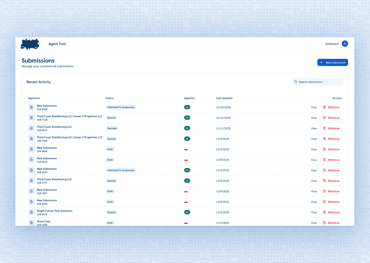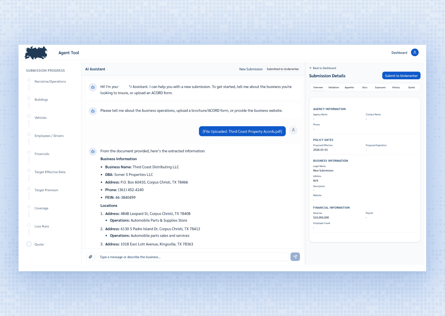 Research showed ACORD submissions were a massive bottleneck. Agents spent hours filling 50–100+ page forms and re-entering data. By the time it reached underwriting, it already carried structural inefficiencies.